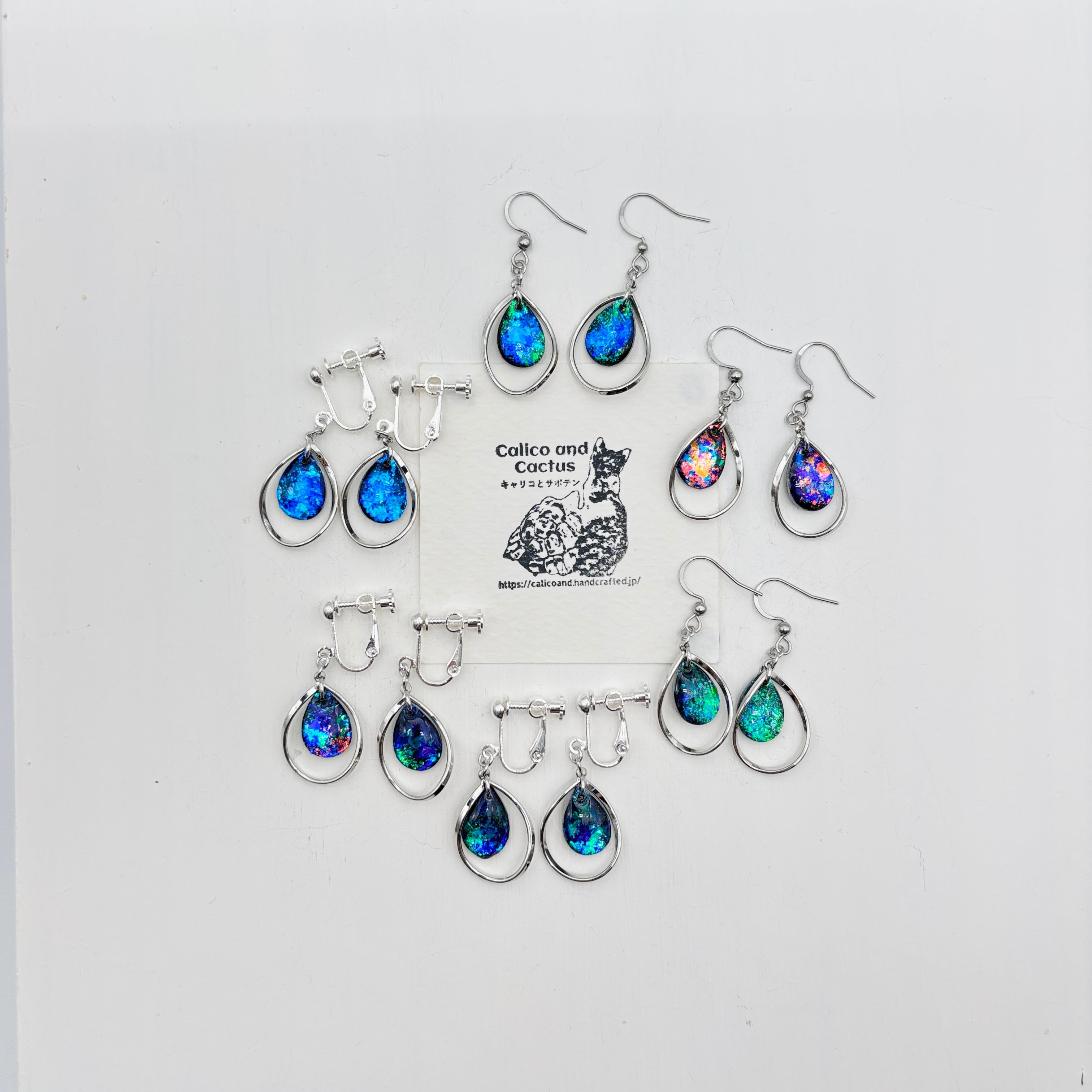 ご覧頂きありがとうございます。 【金具変更可能】【バリエーションあり】 特殊なホログラムを配合した面、天然貝の面とリバーシブルに違う輝きが楽しめる耳飾りです。 揺れると偏光で何色にも見えるカラーチェンジをお楽しみください。 色合いを長くお楽しみ頂く為、レジン部分には仕上げにUVカットコーティングを施しています。 ピアス形状:ネジバネ式イヤリング/キャッチ式ピアス レジン部分:約1.8cm 金具:サージカルステンレス 【購入前にご一読ください】 ひとつひとつ丁寧に制作しておりますが、ハンドメイド品にご理解ある方のご購入をお願いしています。 ※ご購入前に必ず発送先住所等のご確認をお願い致します※ ■掲載写真は現品ではなく見本です。 見本同様にお作りいたしますが、手作りの為多少の違いがある場合がございますのでご了承ください。 ■下記、ご理解頂ける方のみご購入ください。 →レジン特性上の気泡、お使い頂く時間経過による黄変など →ドライフラワー等の封入素材の色味の違い →画面上と実物では色が異なって見える場合がありますが、全行程手作業の為色や形がわずかに異なる一点ものとしてご理解ください。 ■仕上げにUVカットコーティングを施しています。 レジンに比べ少し柔らかい素材の為、優しくお取り扱いください。 日光を避けた場所で保管することで更に変色を防ぎ、色合いが変わらずにお使い頂けます。 ■金具パーツは記載がない限り、通常サージカルステンレスを使用しております。 アレルギーが起きにくい素材とはいえ、絶対にないと保証するものではありません。重度の金属アレルギーの方はご注意ください。 ■通常 定形(外)郵便発送となります。 日付指定・追跡・補償はありません。 発送手続きは責任を持って行っておりますが、その後の紛失等は責任を持つ事が出来ません。 ■商品のお届け時期 平日:代金のお支払い確定後、1-2日以内に発送いたします。 土日祝日:代金のお支払い確定後、次営業日に発送いたします。 ※金具変更などの作業がある場合 金具変更及びUVカットコーディングの為7日程度の作業時間をいただき、発送いたします。