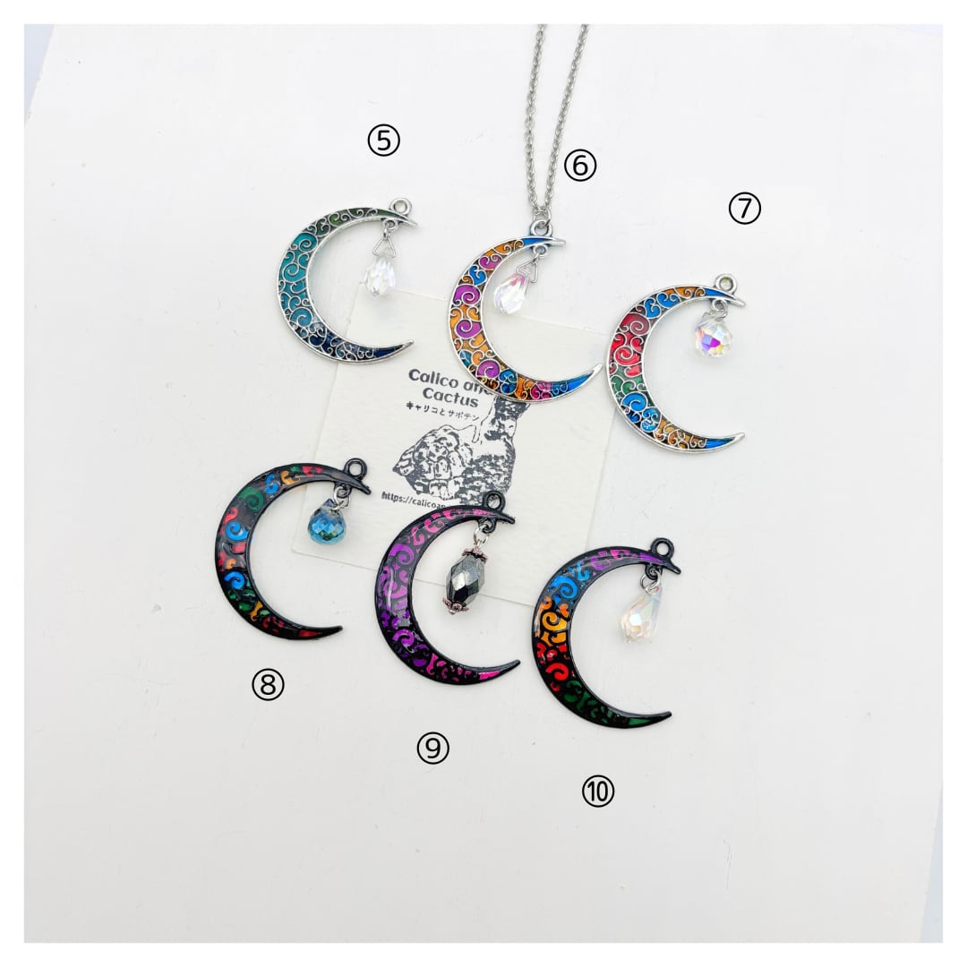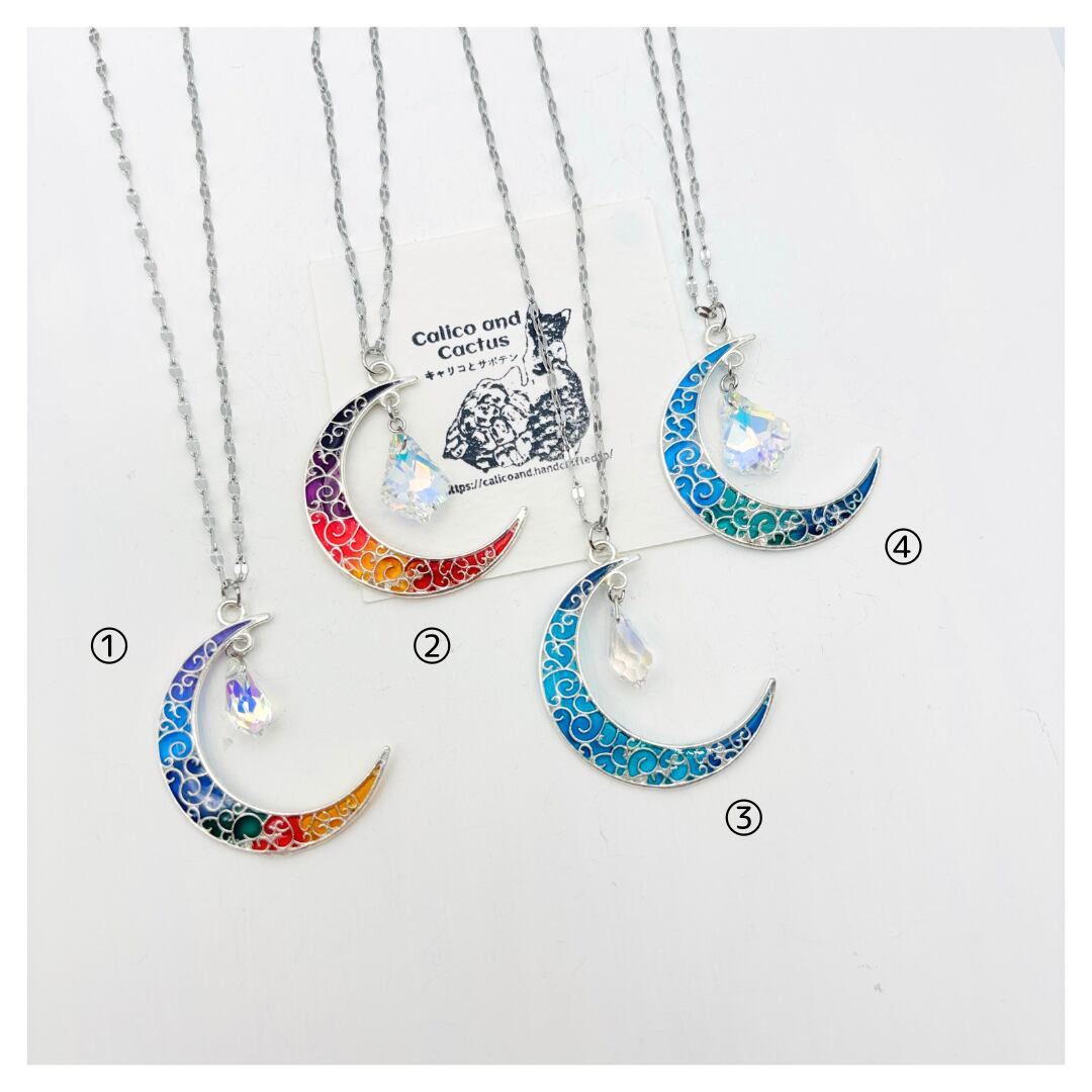 ベネチアンガラスをイメージし、鮮やかに色付けした月モチーフと揺れるクリスタルを合わせたペンダントです。