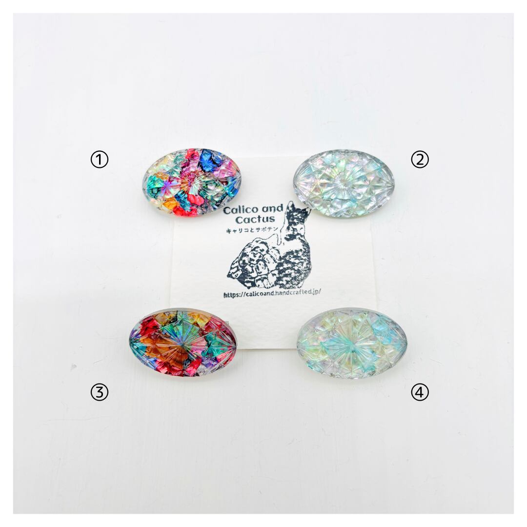 偏光貝を一枚ずつパズルのように組み合わせ、鮮やかさや輝きを最大限に引き出したブローチです。