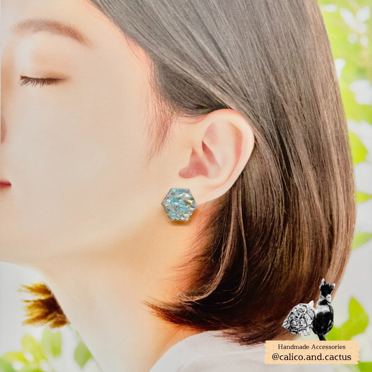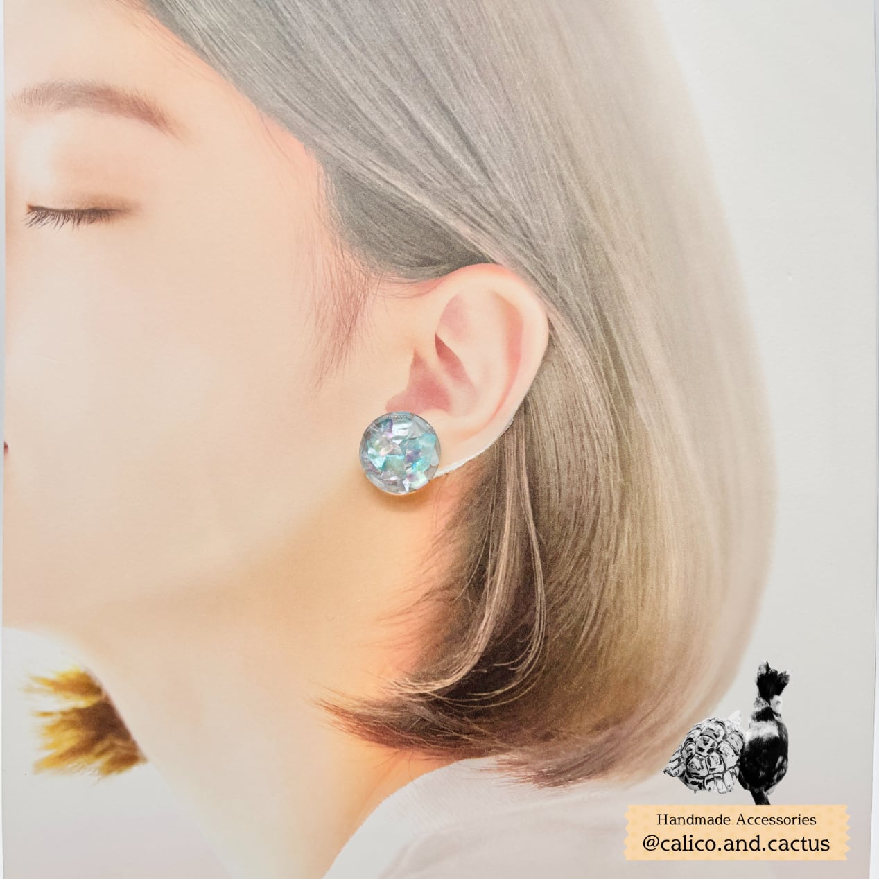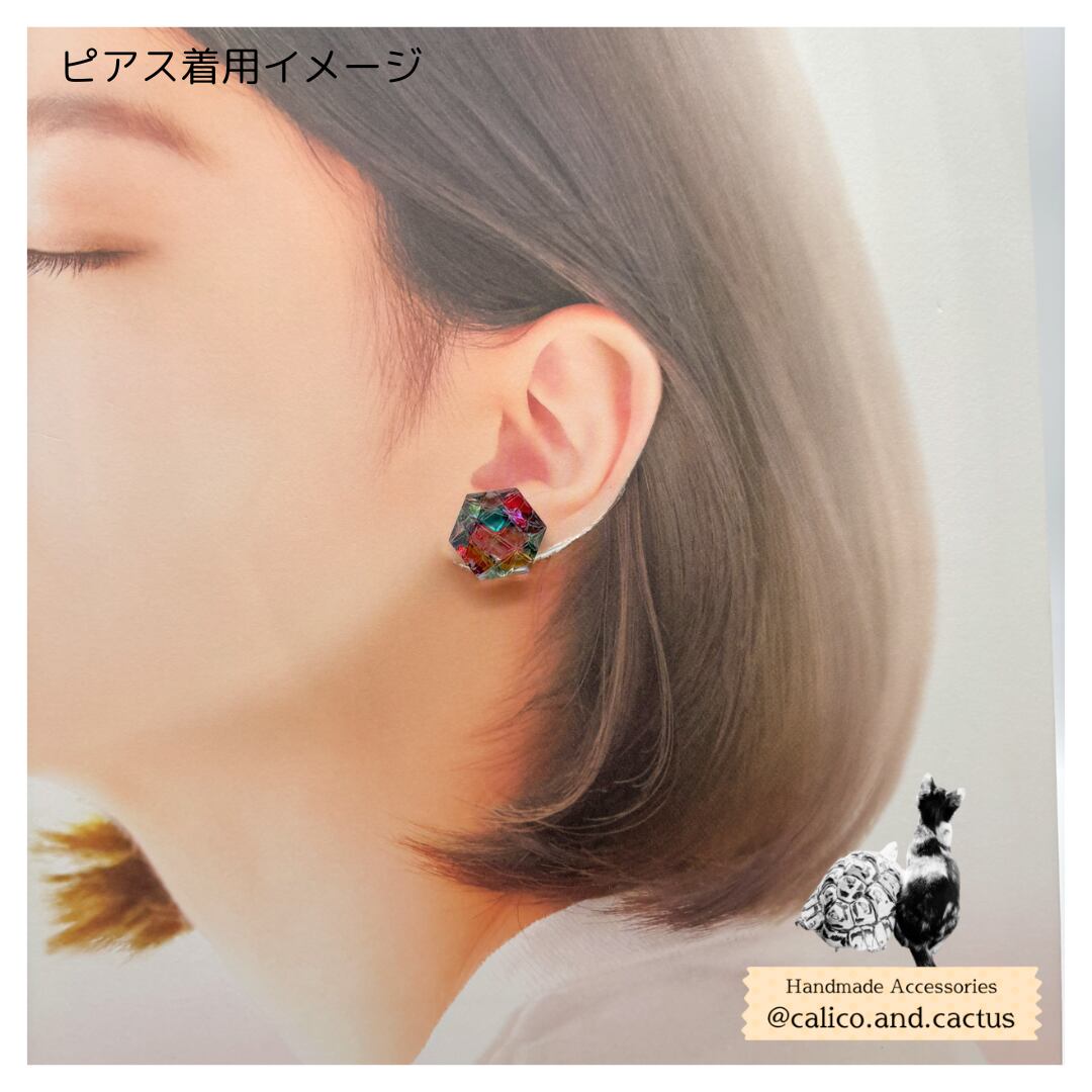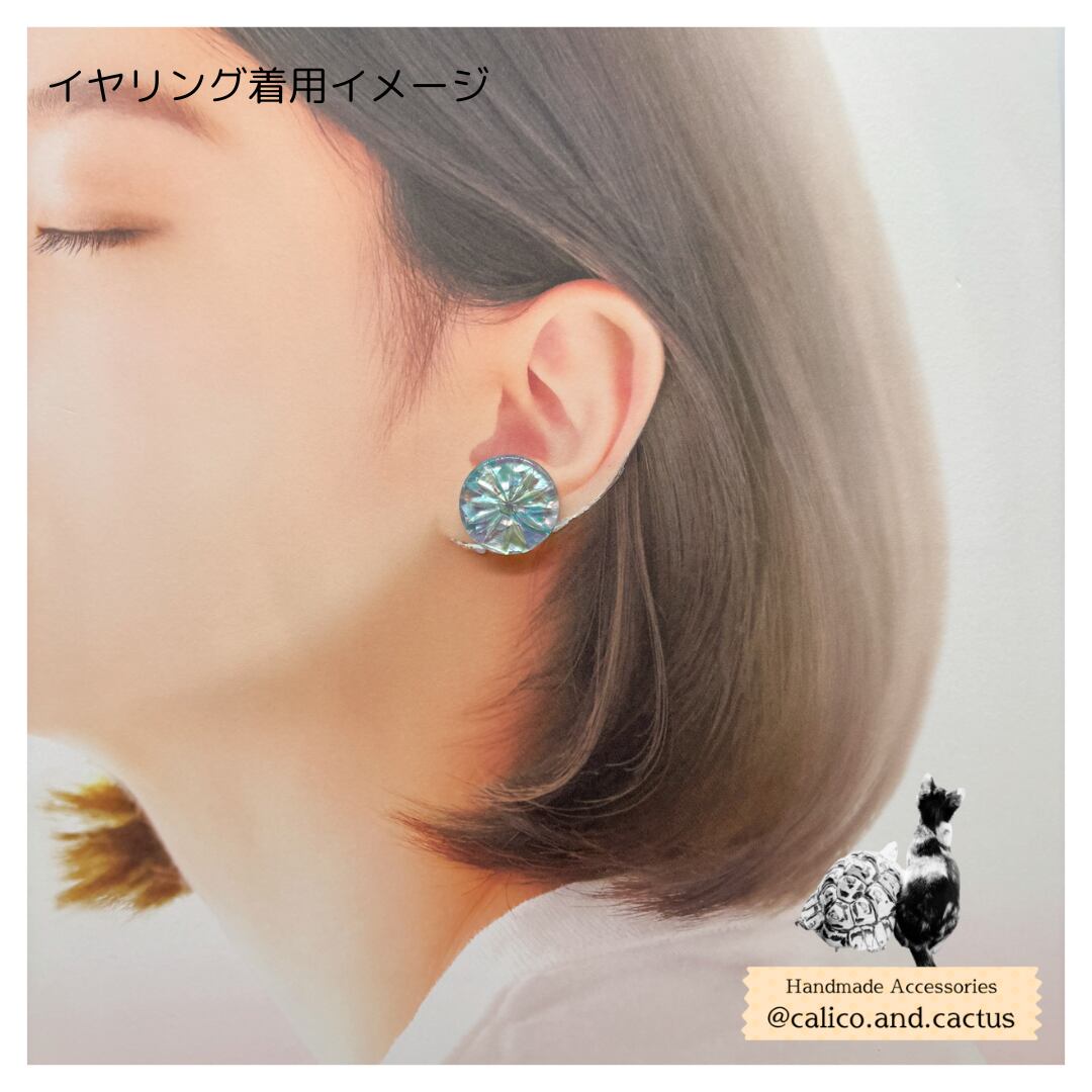偏光貝を一枚ずつパズルのように組み合わせ、鮮やかさや輝きを最大限に引き出した耳飾りです。