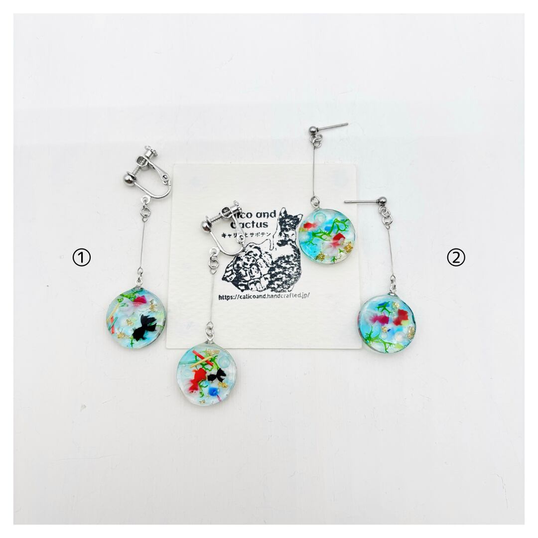 水草に見立てたドライモス、金箔を封入し、泳ぐ金魚も手づくりしております。