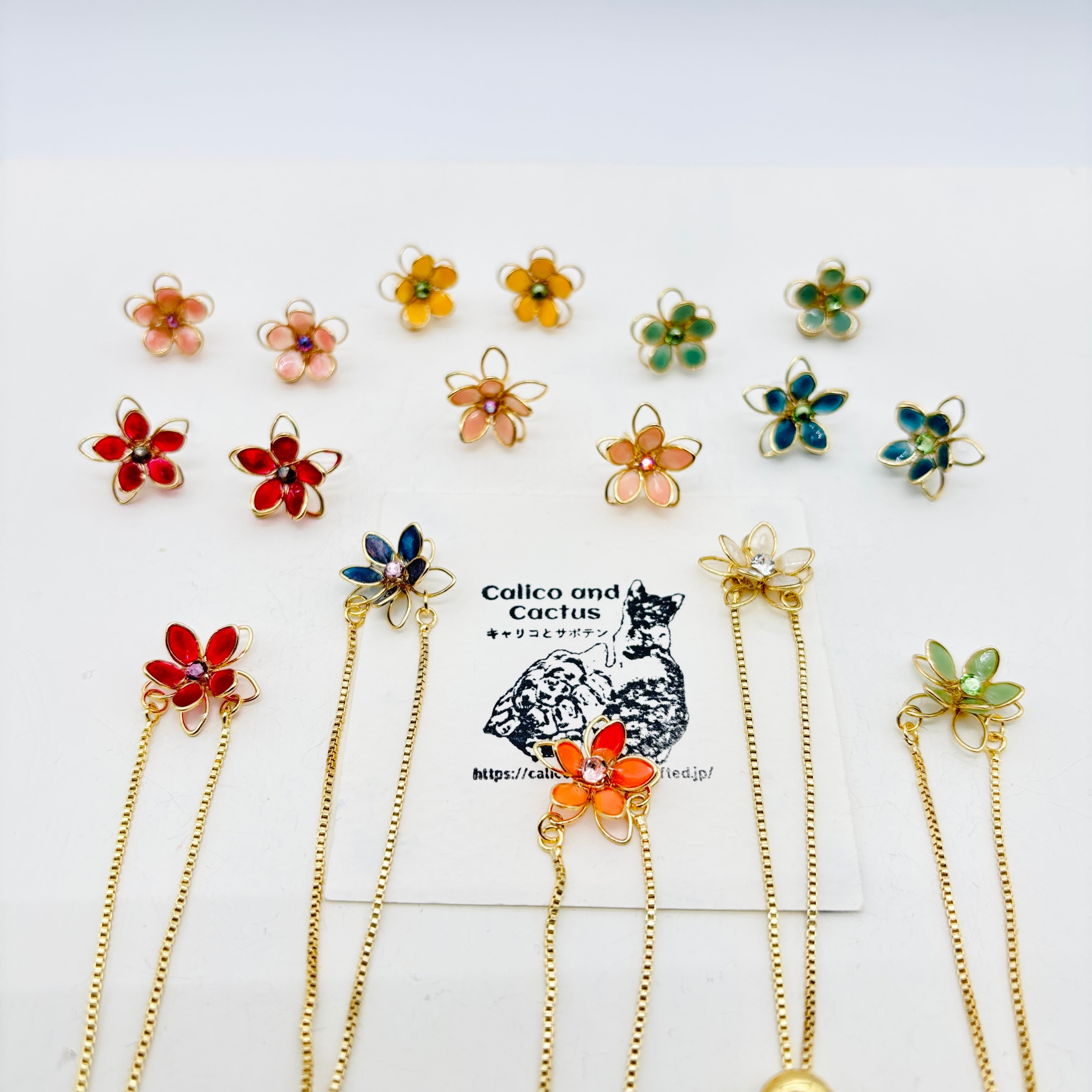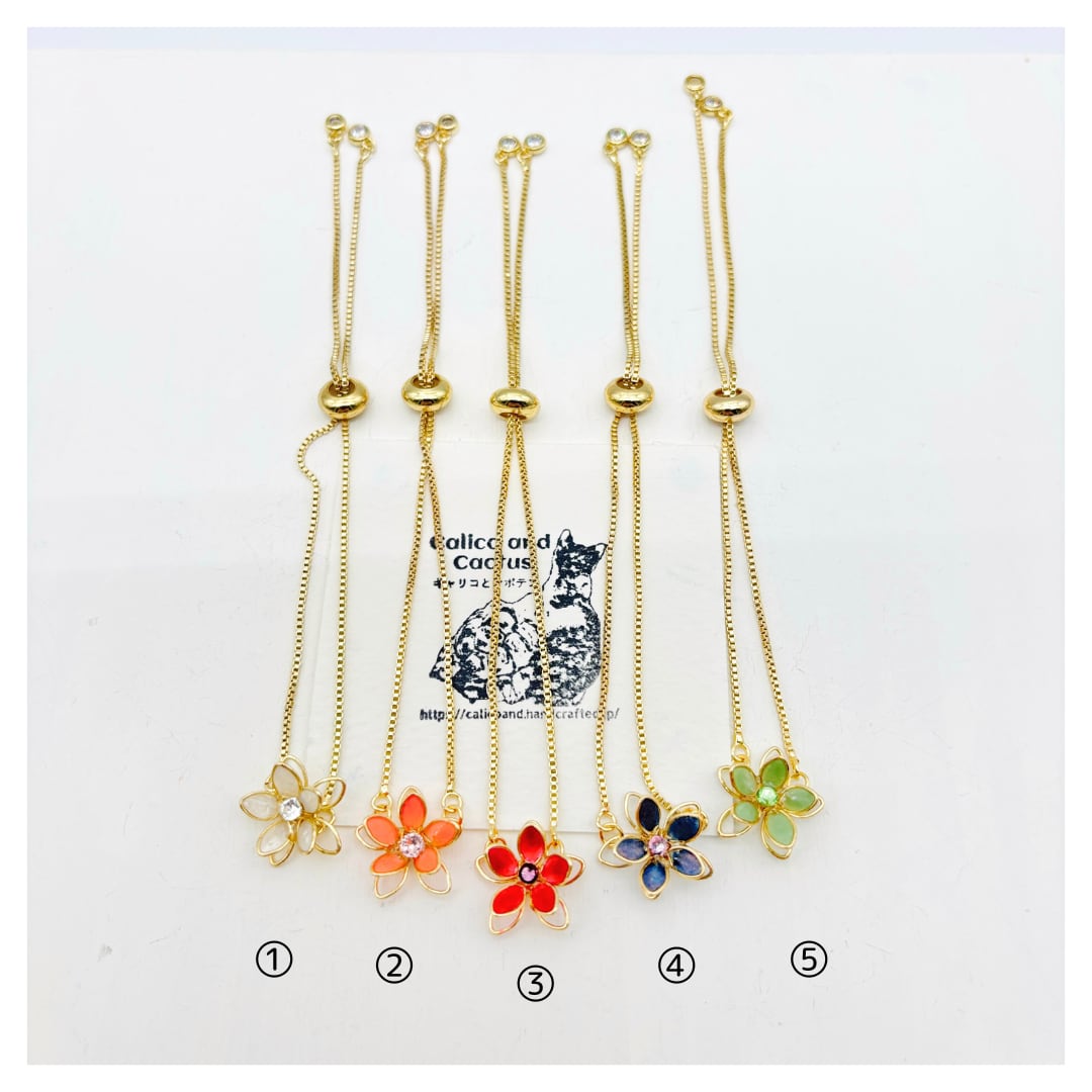 成形したワイヤーフラワーを色付けし、花芯部分にスワロフスキーを使用したシンプルデザインのブレスレットです。