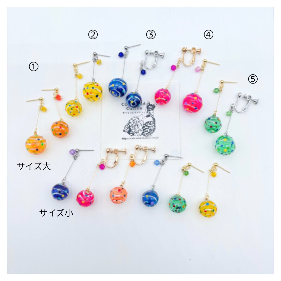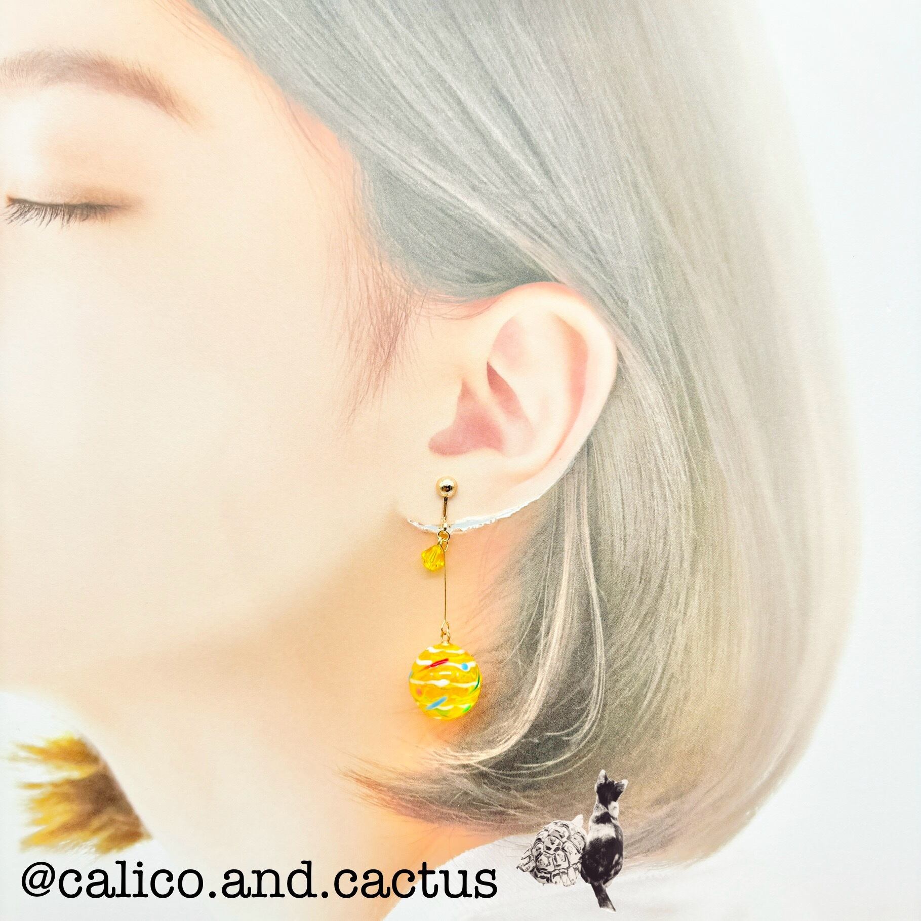 ガラスドームを丁寧にカラーコーティングし、模様を一つ一つ手描きで入れている水風船の耳飾りです。