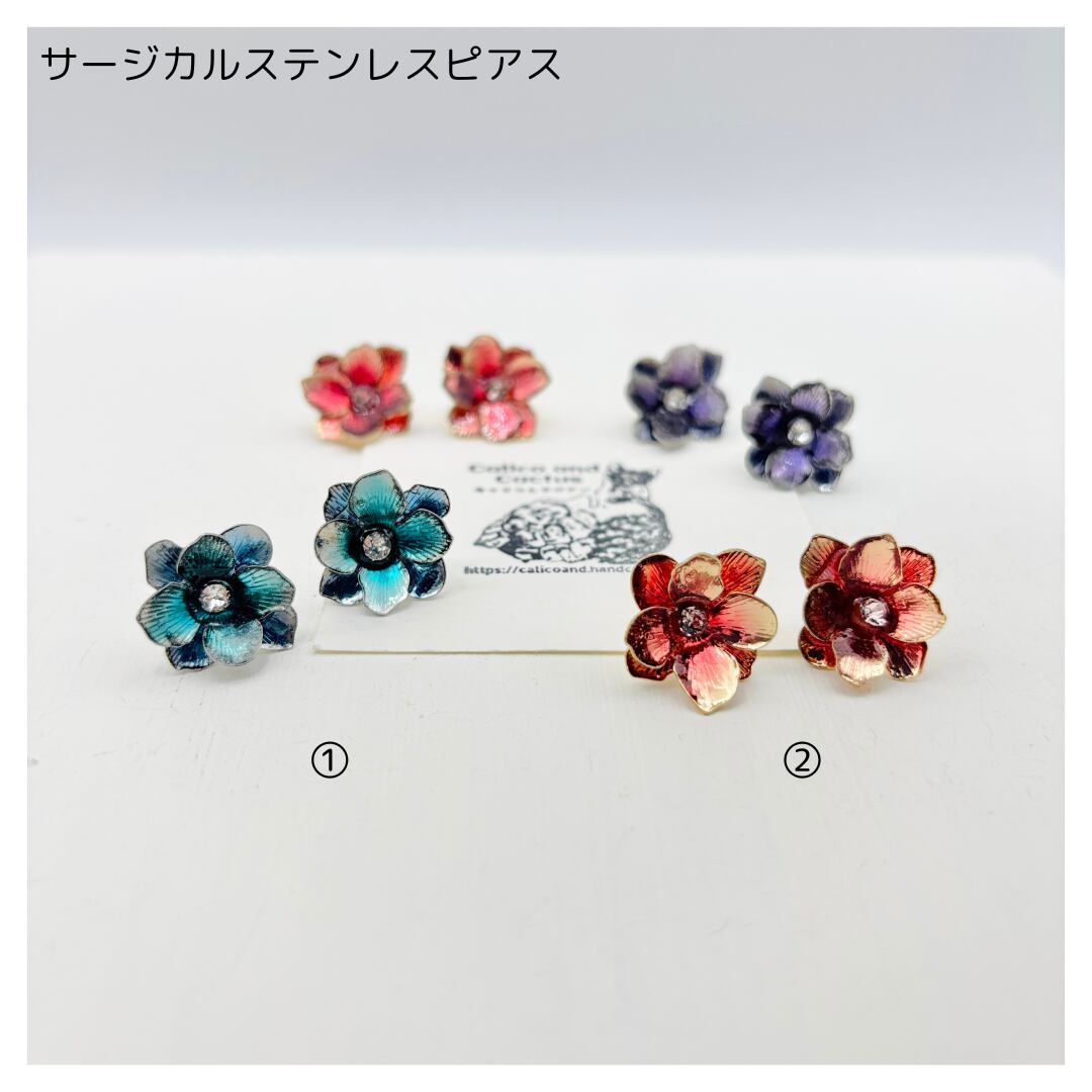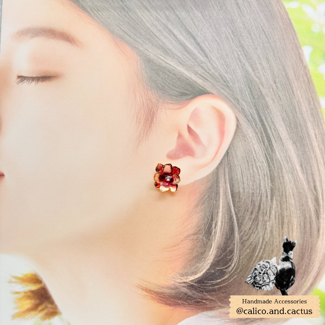 形成したメタルフラワーを丁寧に色付けし、花芯部分にスワロフスキーを使用した耳飾りです。