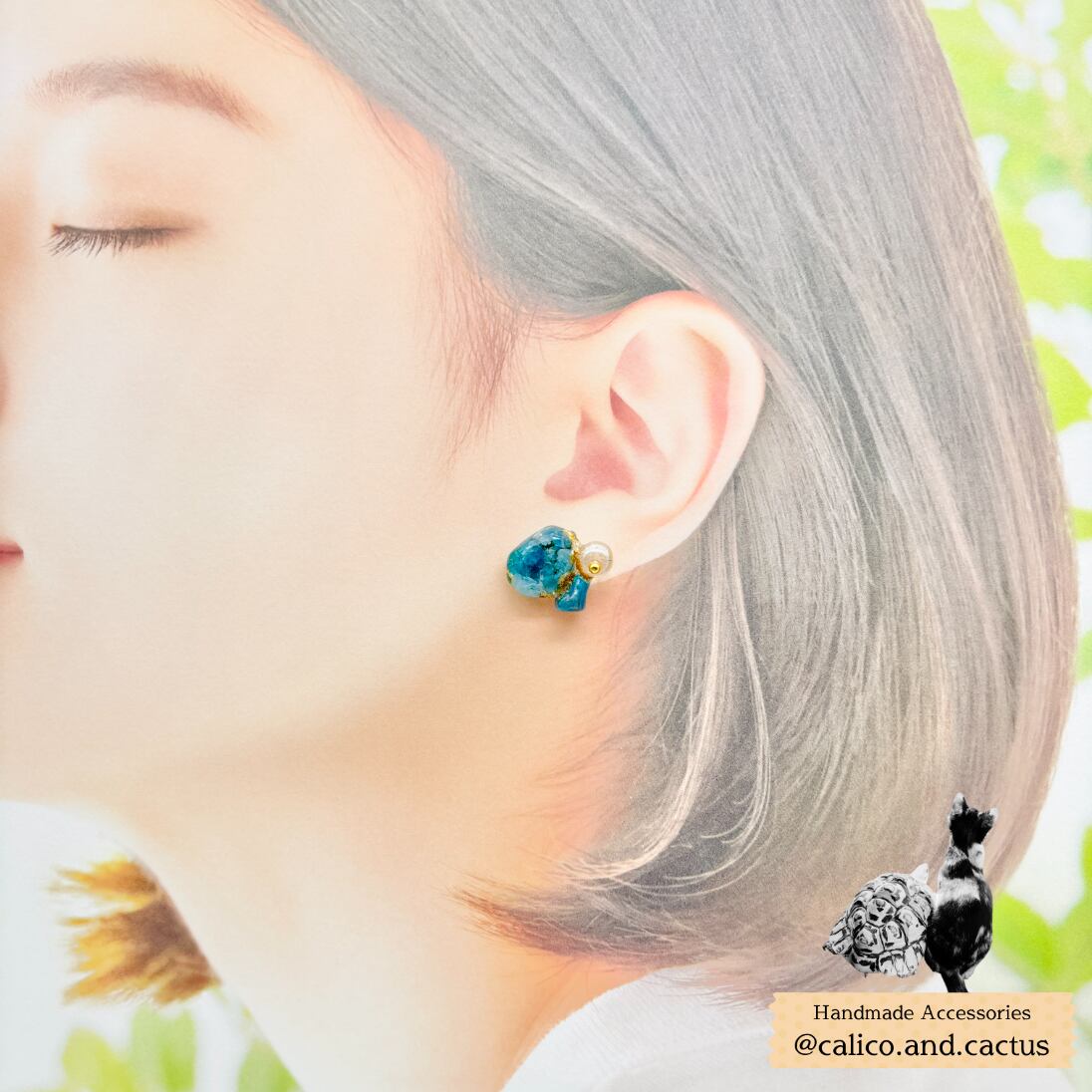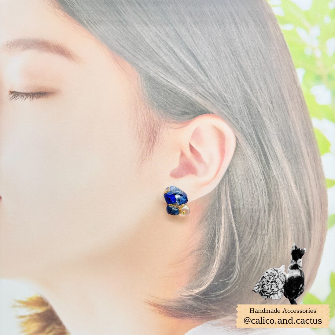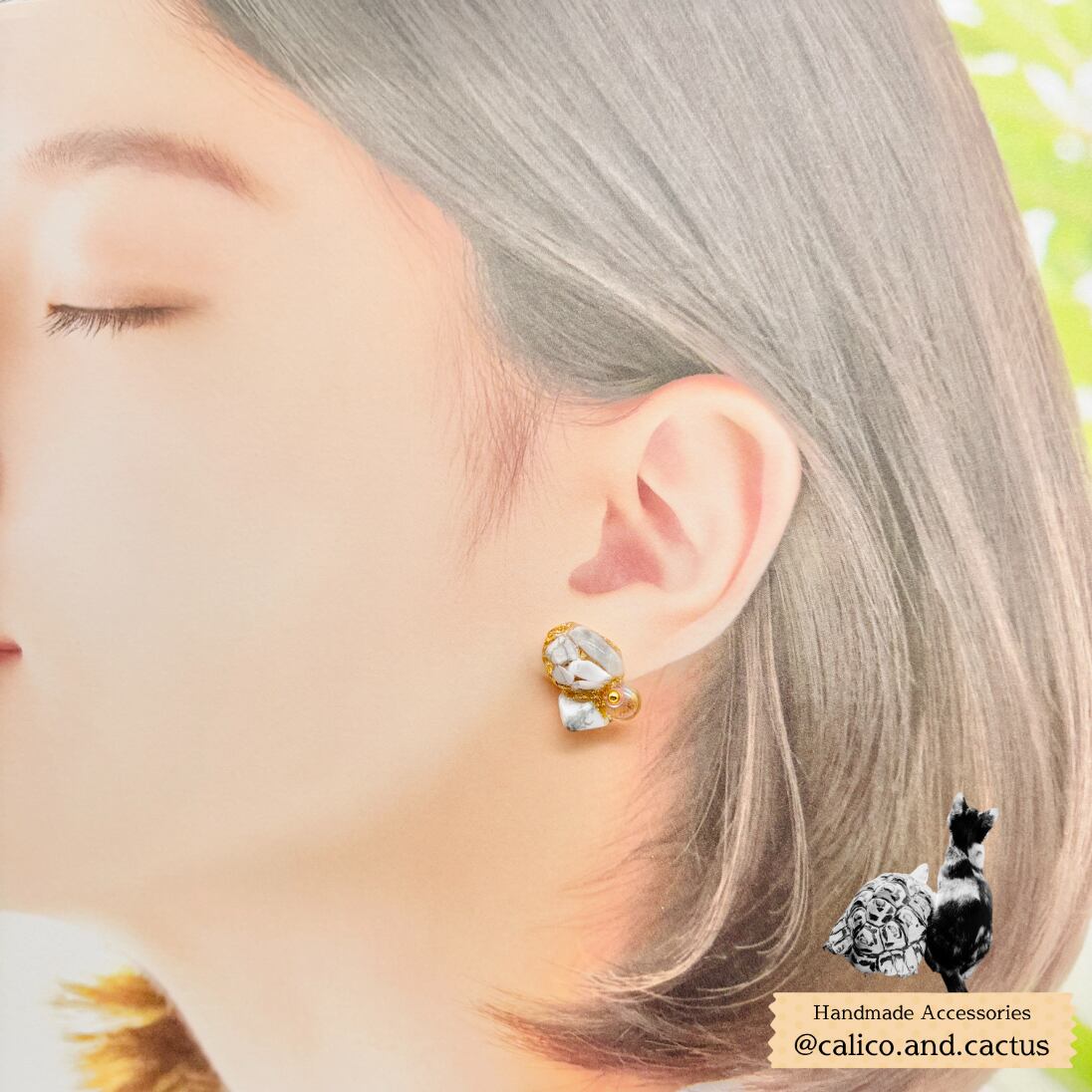 不揃いな天然石を組み合わせ、金継ぎ風の耳飾りに仕立てました。