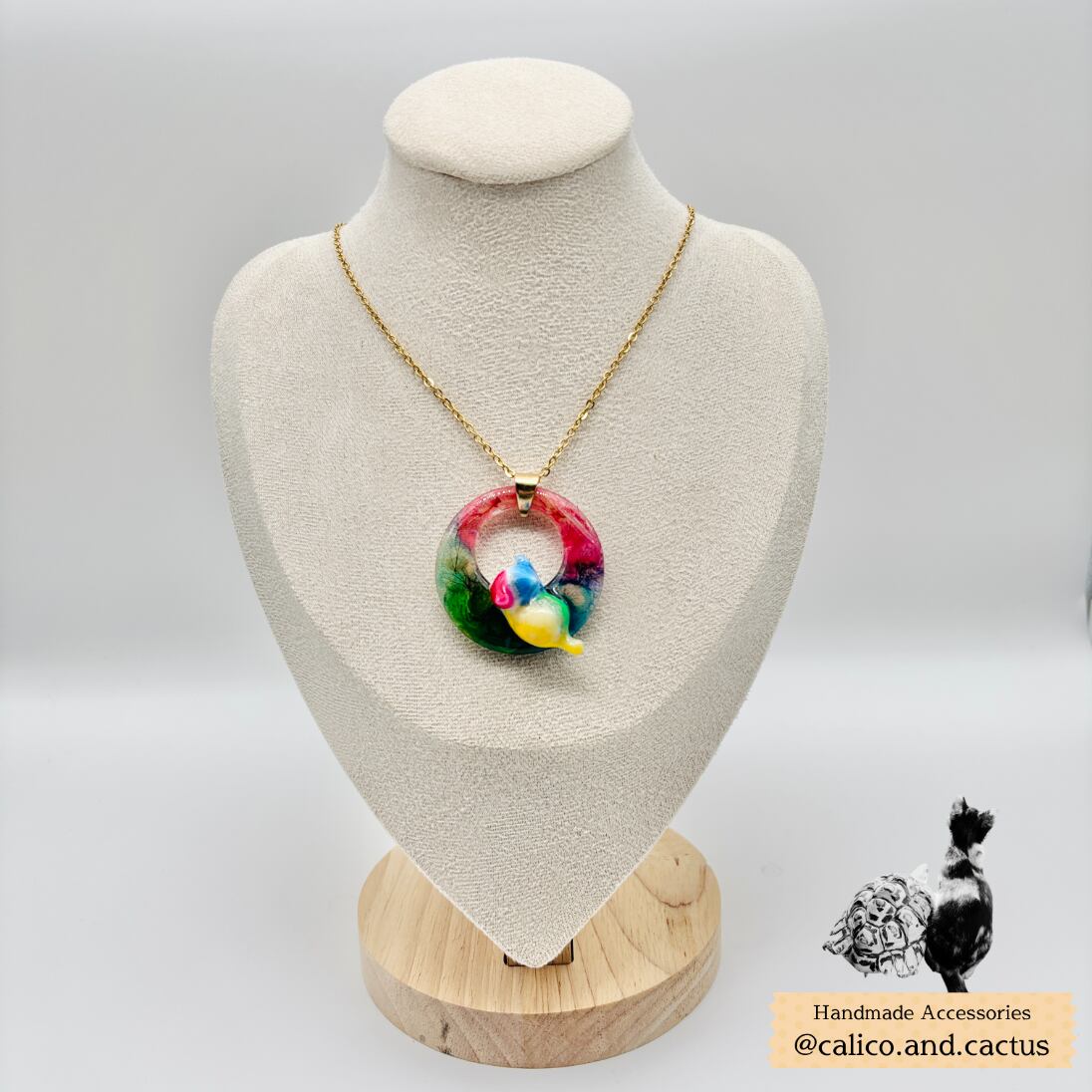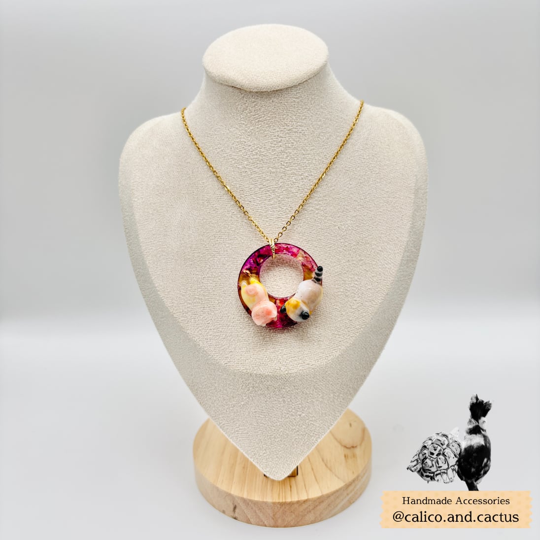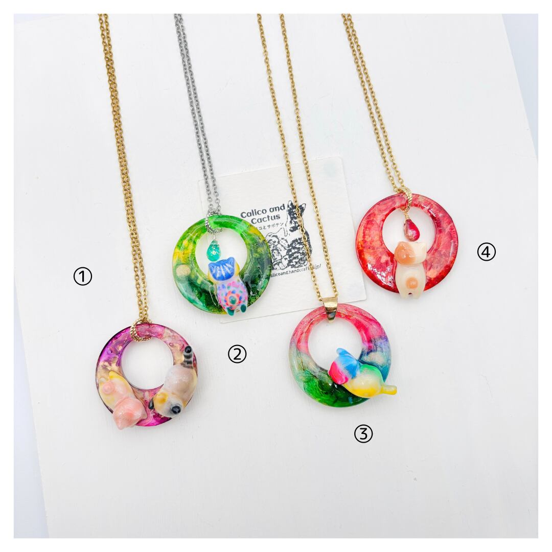 自家製ドライフラワーが封入された片面と、鮮やかなインクアートにしがみついたにゃんこがアクセントのペンダントです。