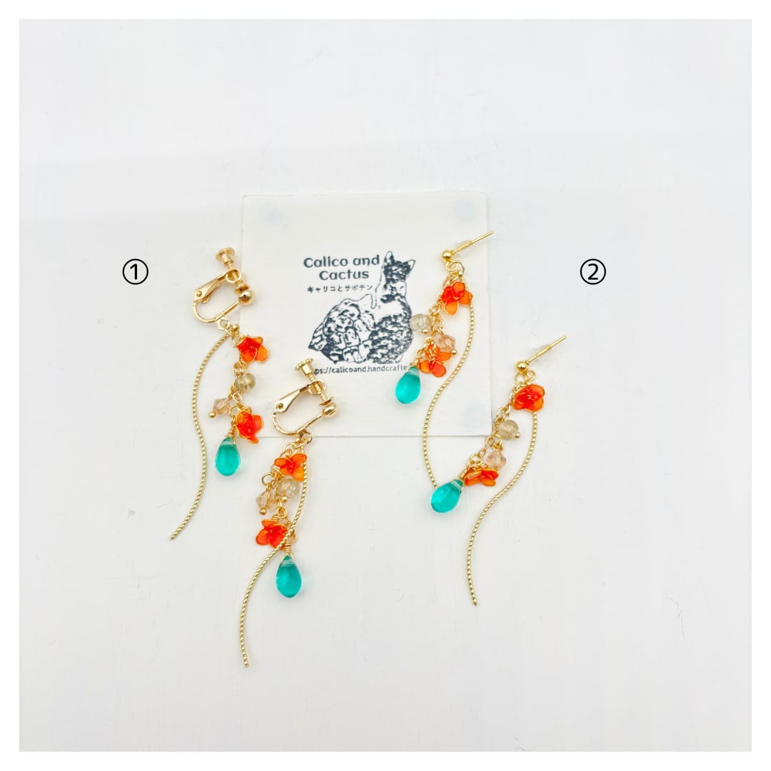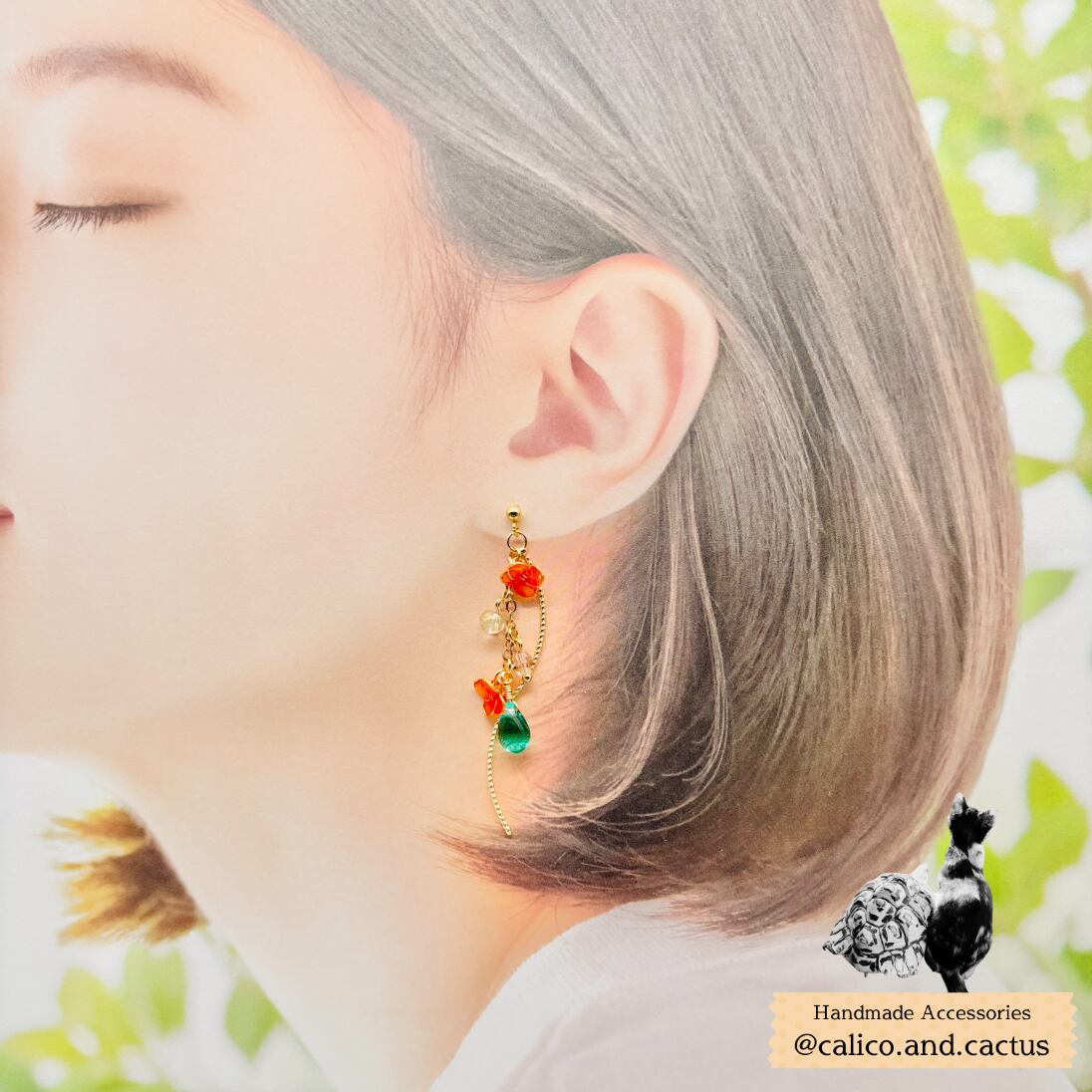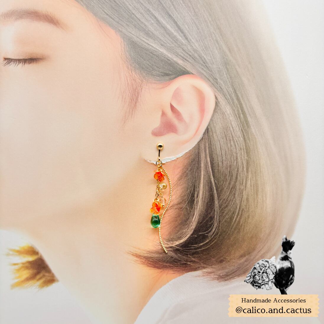 ワイヤーで形成したキンモクセイとチェコガラスを合わせたラインシルエットの揺れる耳飾りです。