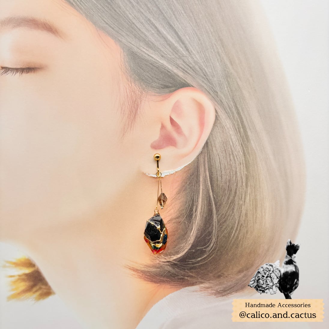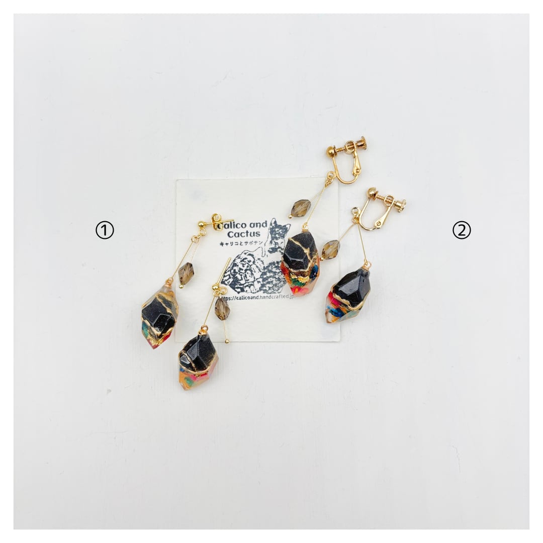 一粒ずつ自作したカラフルなさざれ石を鉱石に閉じ込めた耳飾りです。