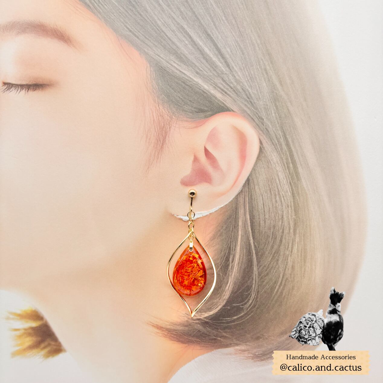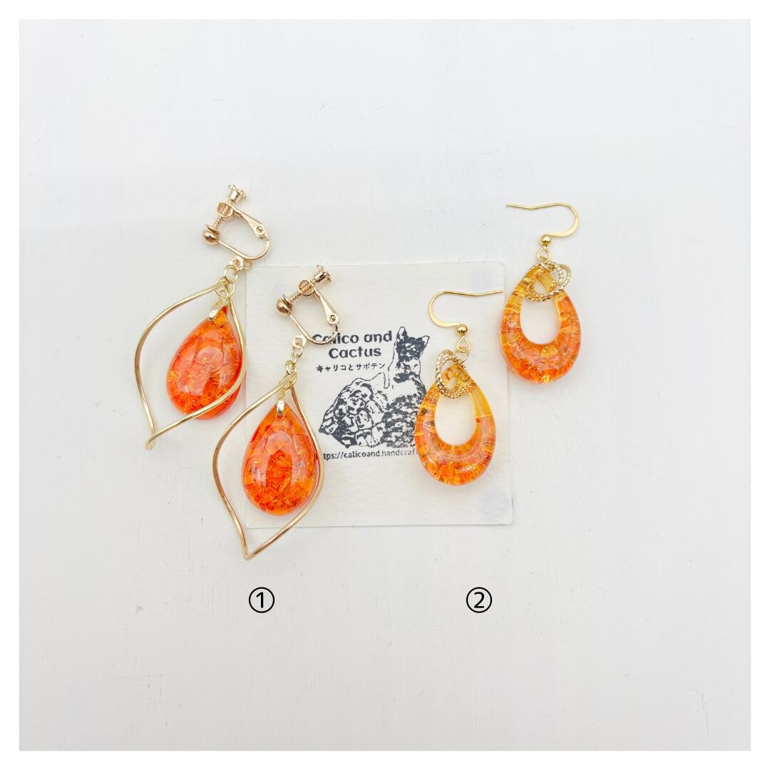 今秋のキンモクセイを閉じ込めたドロップが揺れる大振りタイプの耳飾りです。