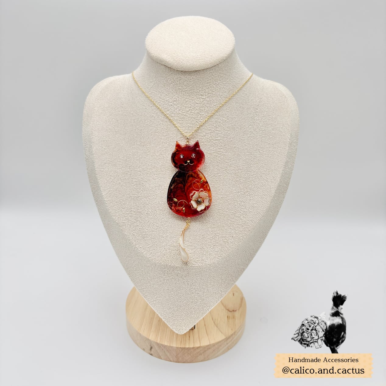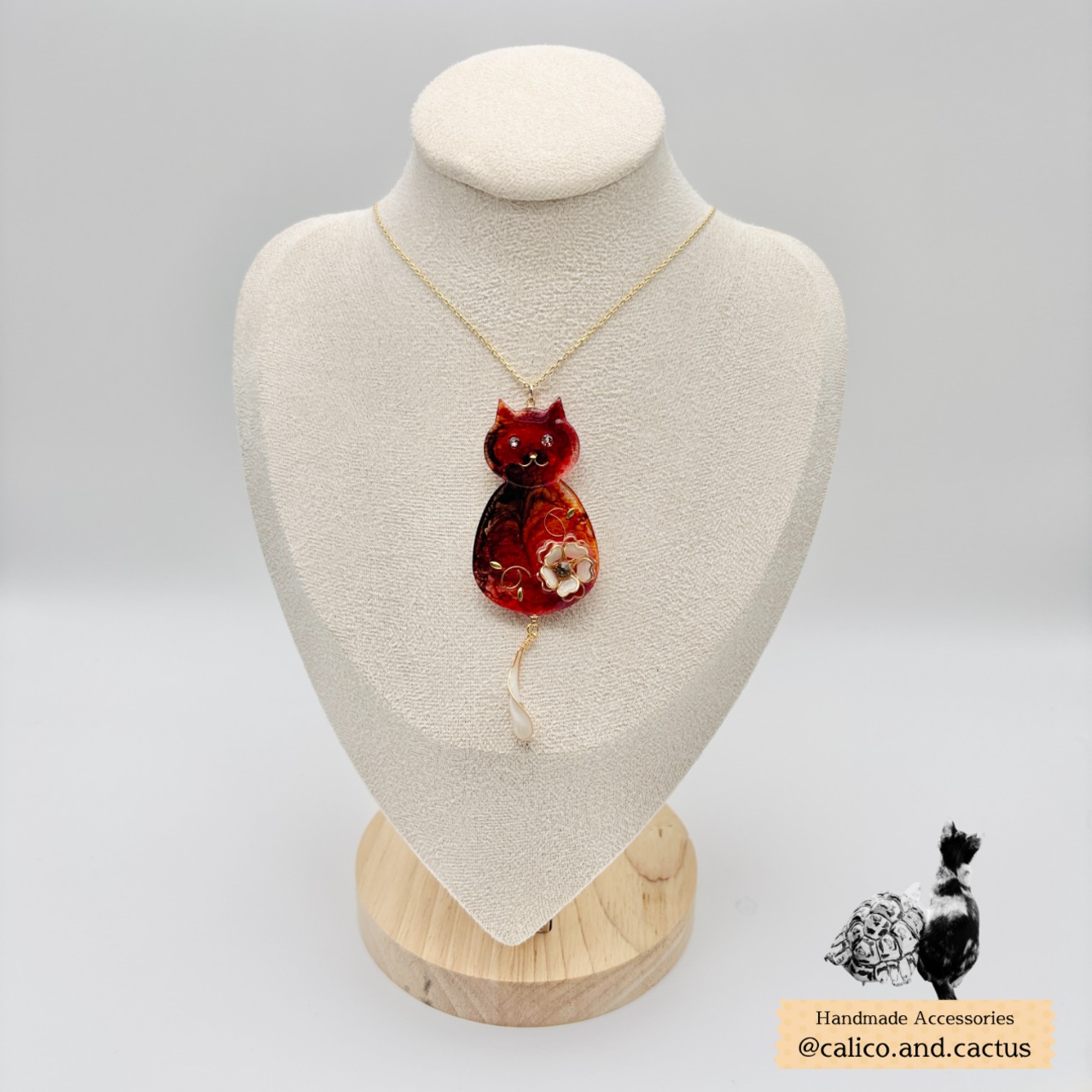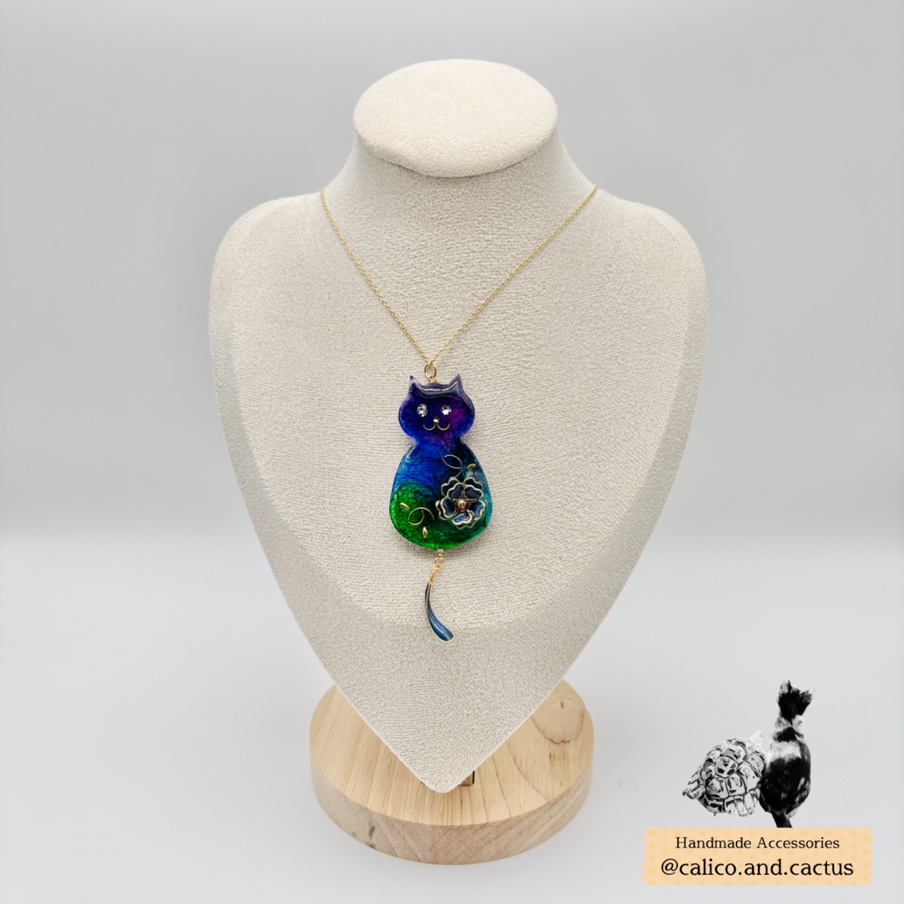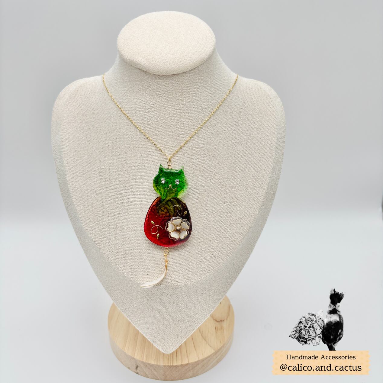 一期一会のインクアートで模様付けしたネコモチーフに、スワロフスキー、ワイヤーで形成した花や揺れるしっぽをあしらった、存在感のあるペンダントです。