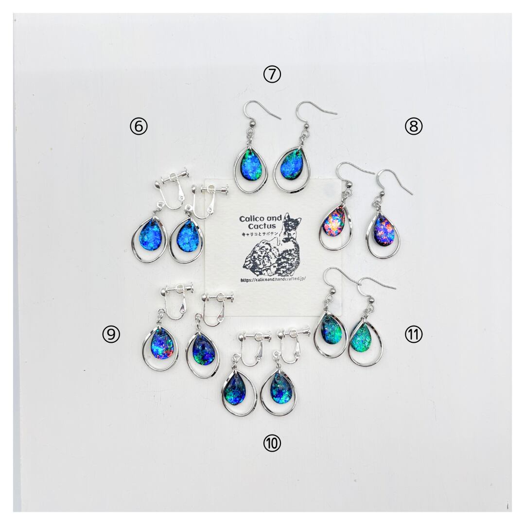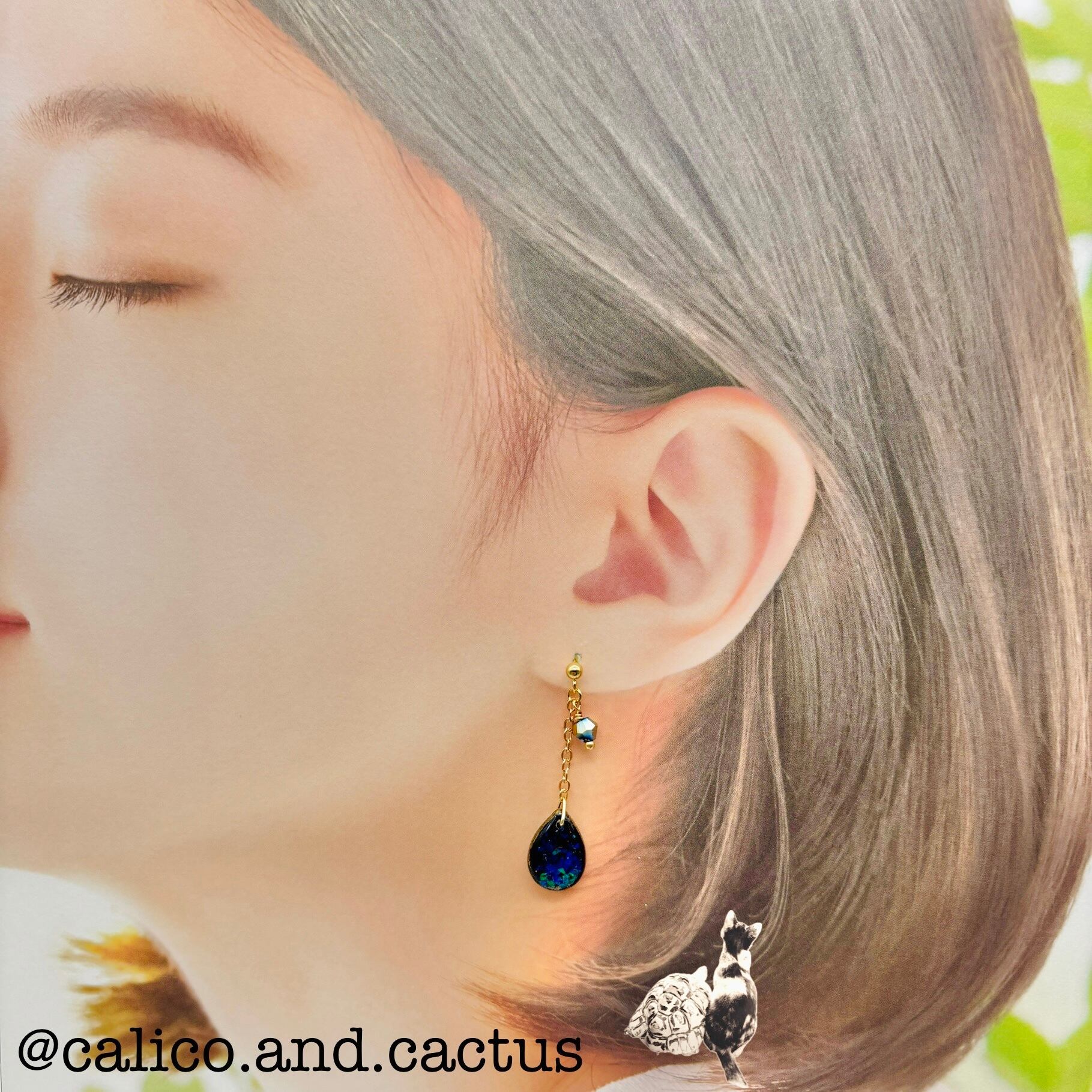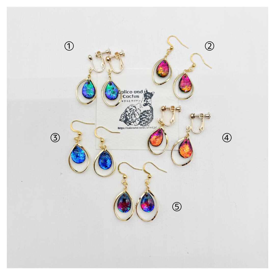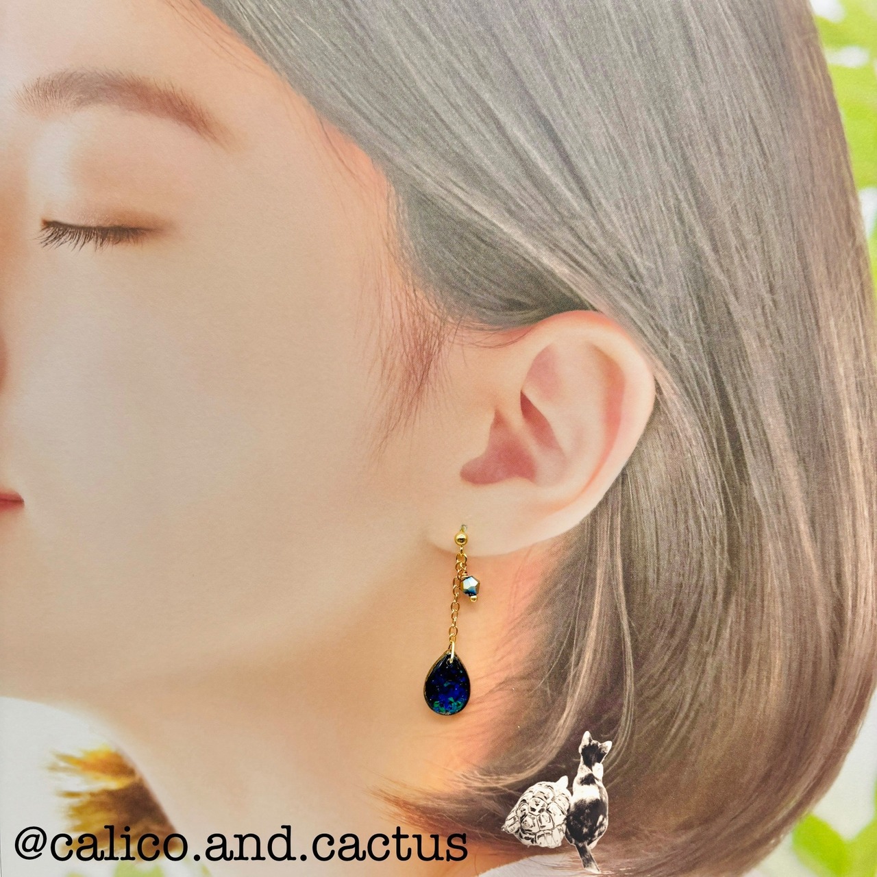 特殊なホログラムを配合した面、天然貝の面とリバーシブルに違う輝きが楽しめる耳飾りです。
